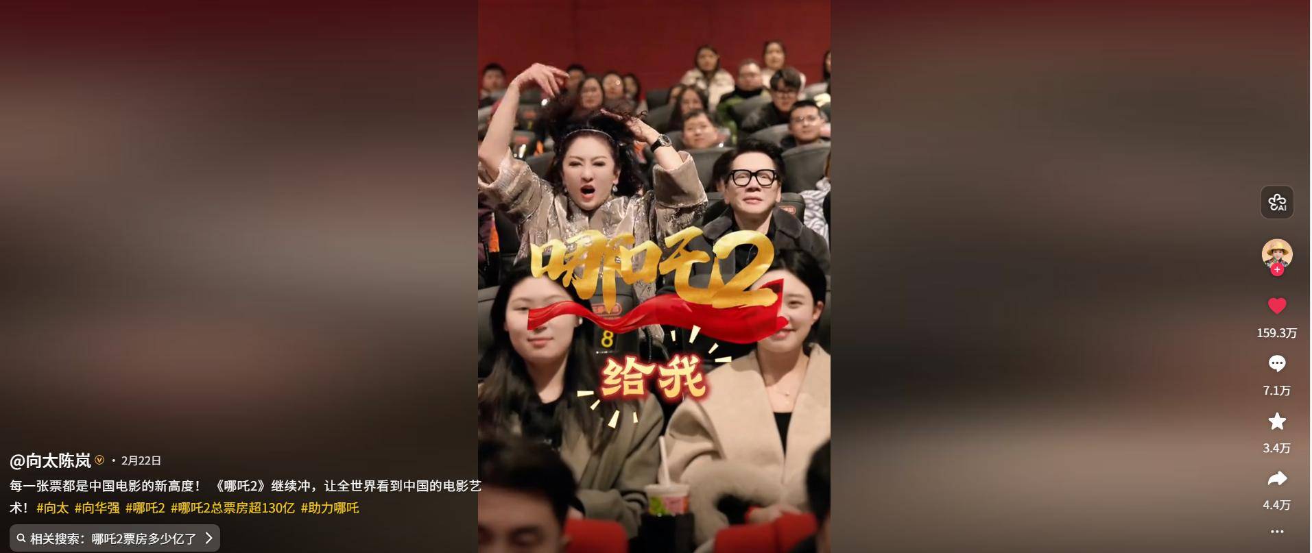 今年年初国产动画《哪吒之魔童闹海》上映时,向太不仅在网上帮忙宣传,还自己掏钱包场,请全公司上下上千名员工一起去看。