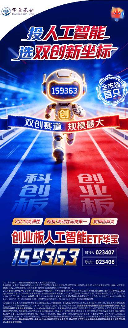 注②:截至2026年1月22日,跟踪创业板的人工智能主题ETF共8只,跟踪科创板的人工智能主题ETF共10只,跟踪科创创业AI主题的ETF共7只,其中创业板人工智能ETF华宝(159363)规模达达63.03亿元,最近6个月日均成交超8亿元,为其中规模最大、流动性最佳的产品。