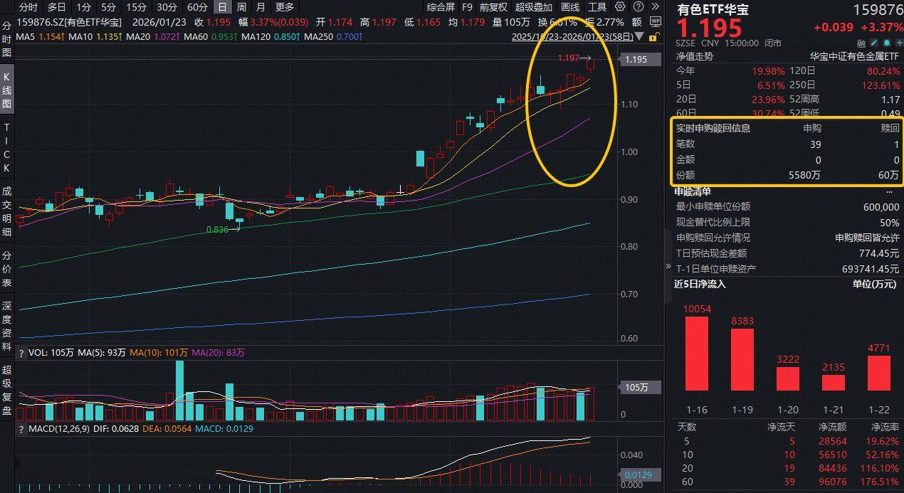 二、【猛拉3.3%!有色ETF华宝(159876)放量突破上市高点!全天获资金净申购5520万份!白银有色等4股涨停!】