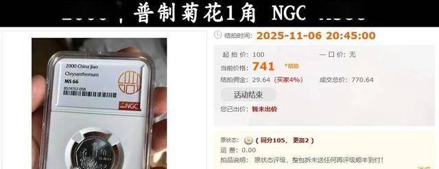 就在今年11月6号,刚拍出去一枚,经过NGC评级得了MS66分,成交价是770.64元。
