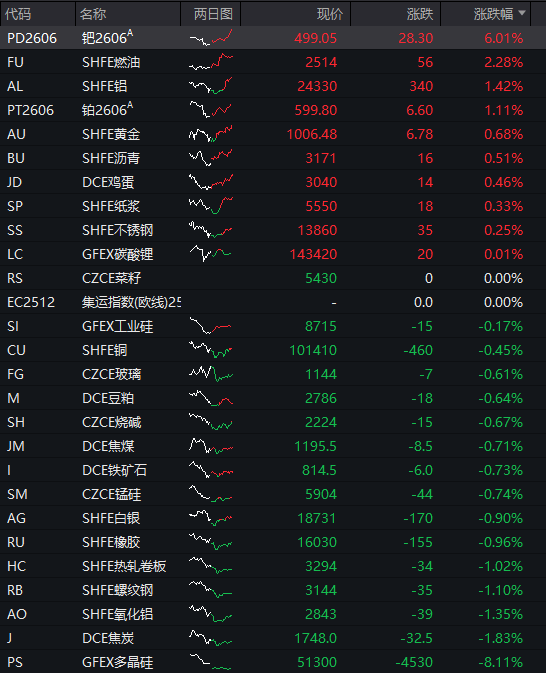 商品:国内商品期货收盘涨跌不一,钯主力涨超6%,LU燃油、原油涨超3%,燃料油涨超2%,沪铝、苹果、甲醇、铂涨超1%。跌幅方面,多晶硅跌超8%,沪镍、BR橡胶跌超2%,硅铁、焦炭、菜粕、纯碱、花生、氧化铝跌超1%。