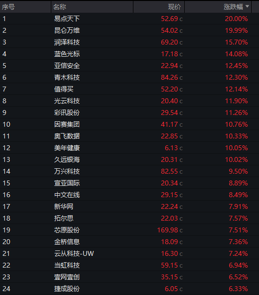 今天,AI应用方向反复活跃,引力传媒5天4板,昆仑万维、粤传媒、易点天下、博瑞传播、国新健康等多股涨停,众诚科技、蓝色光标、中科星图、华胜天成等个股涨幅居前。
