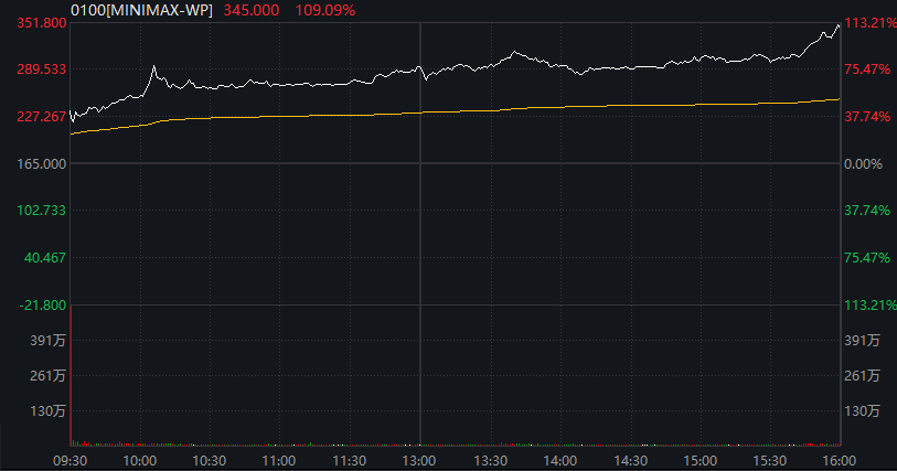大模型公司MiniMax今日登陆港交所,发行价确定在发行区间上限,为165港元/股。早盘高开涨超50%,此后震荡走高,截至收盘,涨幅达109.09%,报345港元/股,成交额达40亿港元,总市值超千亿港元。