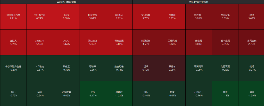 板块方面,AI应用题材爆发,影视、短剧游戏方向领跑。商业航天、人形机器人、小金属概念股、可控核聚变等板块涨幅居前,保险、航空机场、光伏设备、银行等板块逆势下跌。
