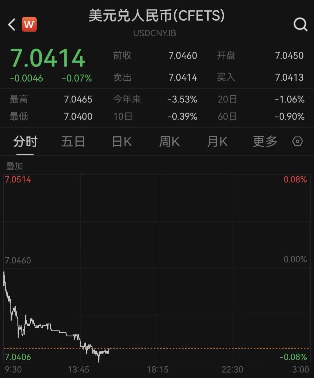12月18日,人民币对美元即期汇率开盘报7.0450,盘中最高升至7.0400,突破前期高点(12月16日盘中最高升至7.0410),创下2024年10月以来的14个多月新高。