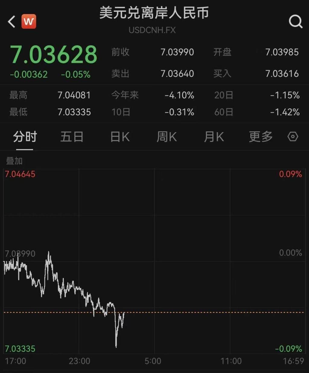 离岸市场上,截至发稿,更多反映国际投资者预期的离岸人民币对美元汇率盘中最高升至7.03335,较前一交易日7.0399的收盘价小幅走高。