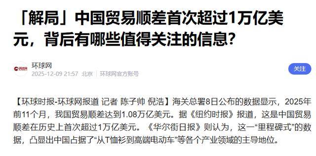 2025年前11个月,中国贸易顺差达到历史级别的1.08万亿美元!这是“全球订单中国造”的最直接体现。