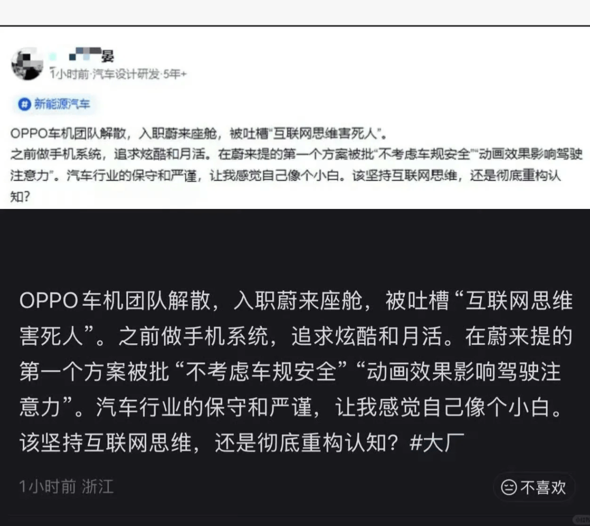 一场来自跨界职场人的吐槽,戳中了新能源汽车行业的核心矛盾 ——OPPO 车机团队解散后,有员工入职蔚来座舱部门,却因带着互联网行业的设计思维碰壁:提出的方案被批 “不考虑车规安全”“动画效果影响驾驶注意力”。一边是互联网追求的炫酷体验与用户活跃度,一边是汽车行业坚守的保守与严谨,这场思维碰撞,不仅让跨界从业者陷入迷茫,更引发了行业对 “智能座舱该如何平衡体验与安全” 的深度讨论。