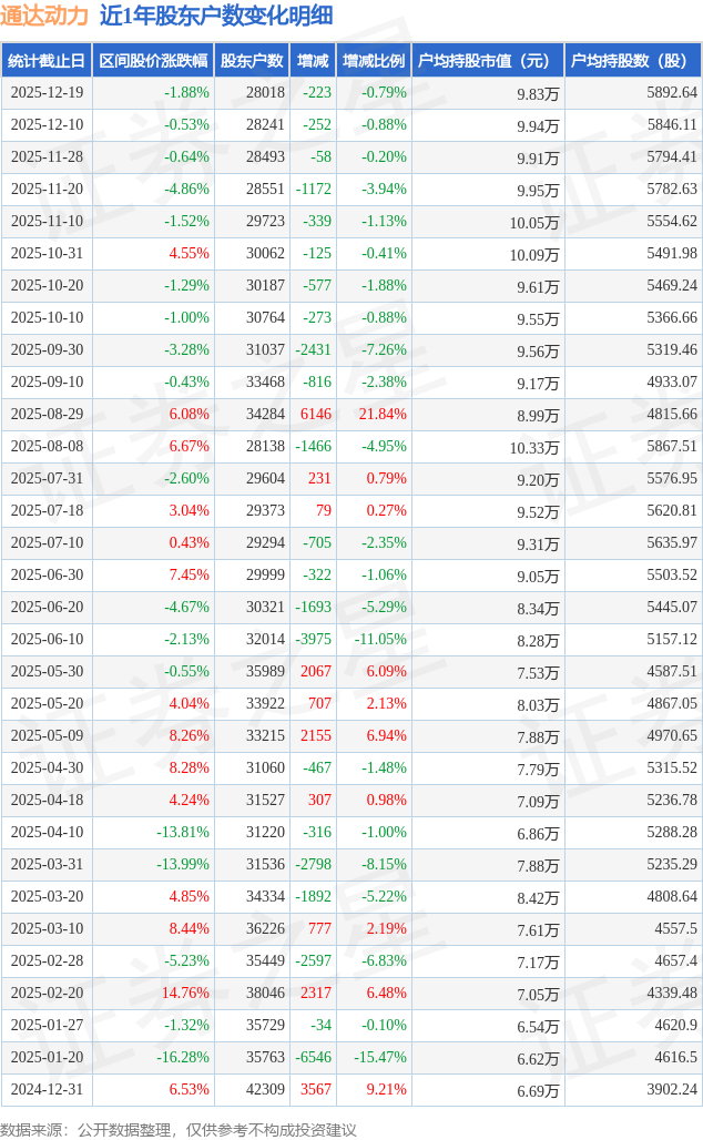 从股价来看,2025年12月10日至2025年12月19日,通达动力区间跌幅为1.88%,在此期间股东户数减少223.0户,减幅为0.79%。