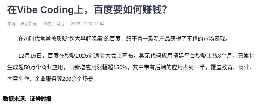 看着秒哒平台上200多个应用场景的数据,我突然想起上周复盘时的一组对比:美股十年长牛与A股震荡行情的本质差异。就像百度选择避开Chatbot红海,专注AI Coding这个能直接创造价值的领域一样,资本市场的赢家永远在寻找真正的价值流动通道。