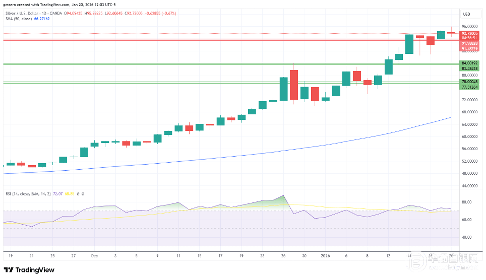 如果银价跌破91.50美元,则将会向近期低点87.00美元附近回落。