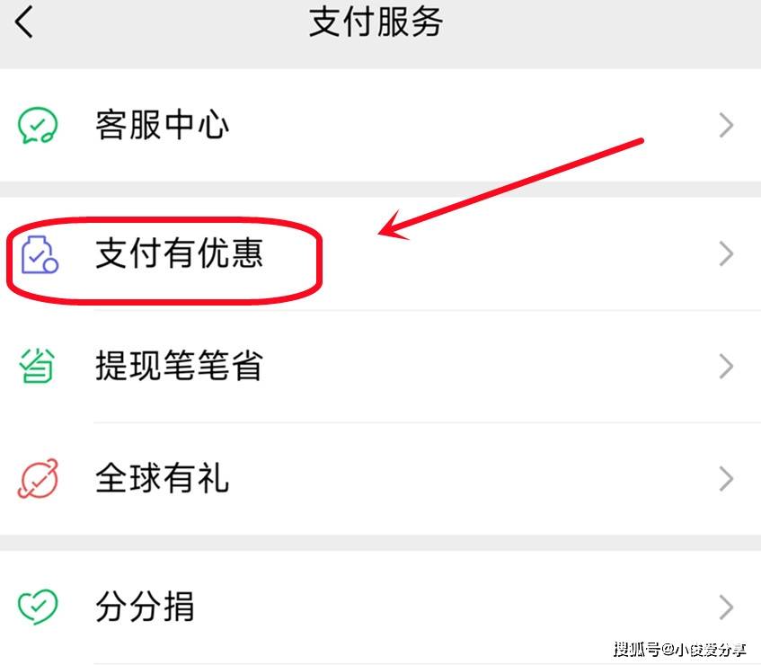 第三步,在支付服务页面里,大家把目光往下看,找到第二个【支付有优惠】,大家看到了吧,咱们点击支付有优惠,看看里面有什么宝贝。