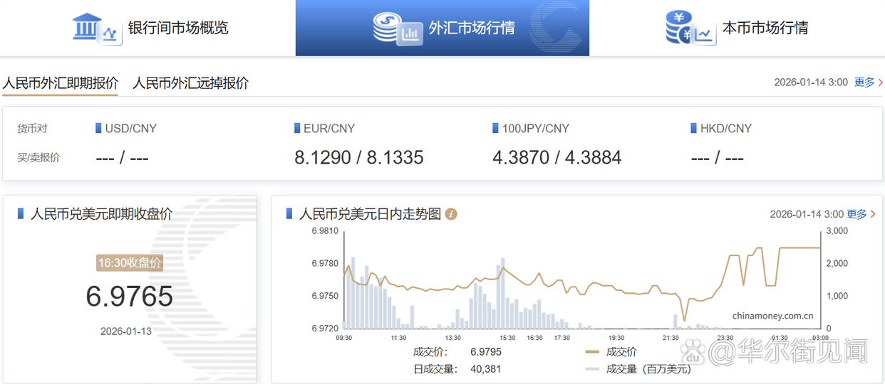 在岸人民币兑美元(CNY)北京时间03:00收报6.9795元,较周一夜盘收盘跌62点。成交量403.81亿美元。