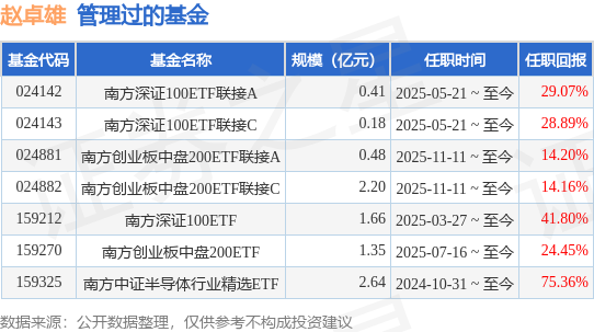 赵卓雄先生:华南理工大学计算机科学与技术硕士,具有基金从业资格。2017年7月加入南方基金,历任数量化投资部研究员、指数投资部研究员;2022年12月12日至2024年10月31日,任投资经理;2024年10月31日至今,任南方中证半导体行业精选ETF基金经理;2025年3月27日至今,任南方深证100ETF基金经理;2025年5月21日至今,任南方深证100ETF联接基金经理;2025年7月16日至今,任南方创业板中盘200ETF基金经理。