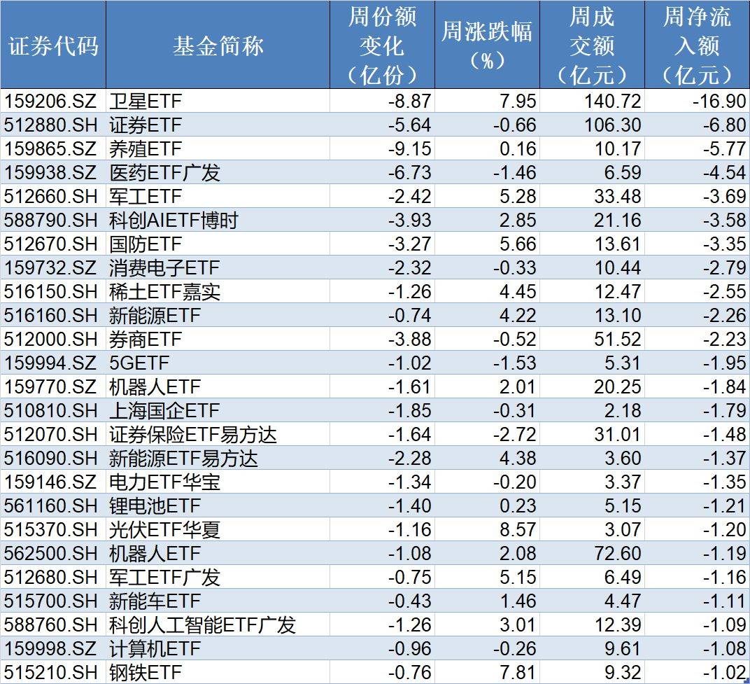 在资金流出方面,本周有25只行业主题ETF净流出逾1亿元,其中卫星ETF、证券ETF和养殖ETF份额分别减少8.87亿份、5.64亿份和9.15亿份,分别净流出资金16.9亿元、6.8亿元和5.77亿元。