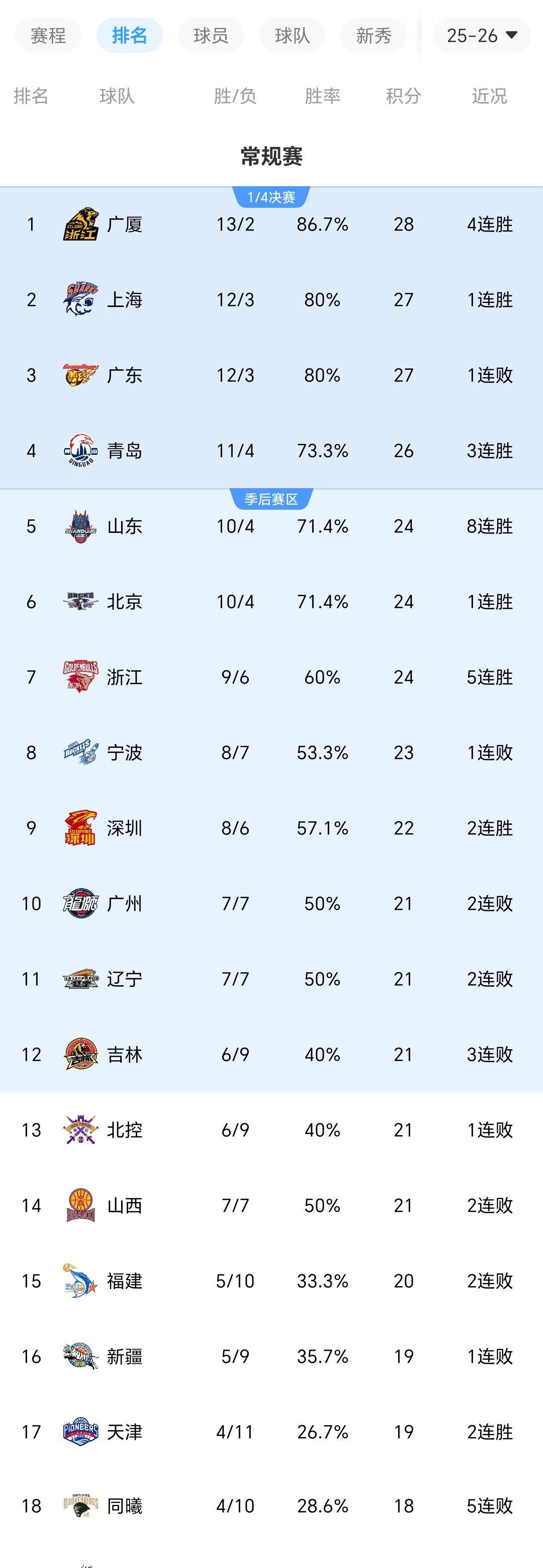 本赛季CBA的竞争格局逐渐明朗,广厦队、广东队、北京队和上海队成为了最有力的冠军争夺者,四支队伍稳居积分榜前四名。上一轮比赛中,广东队曾以大胜同曦取得三连胜,位列第二;而上海队则上一场意外负于深圳,结束了此前九连胜的劲头,积分榜位置从第一跌落至第三。