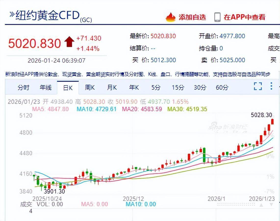 下图是黄金的走势,纽约黄金价格突破了5020美元/盎司。