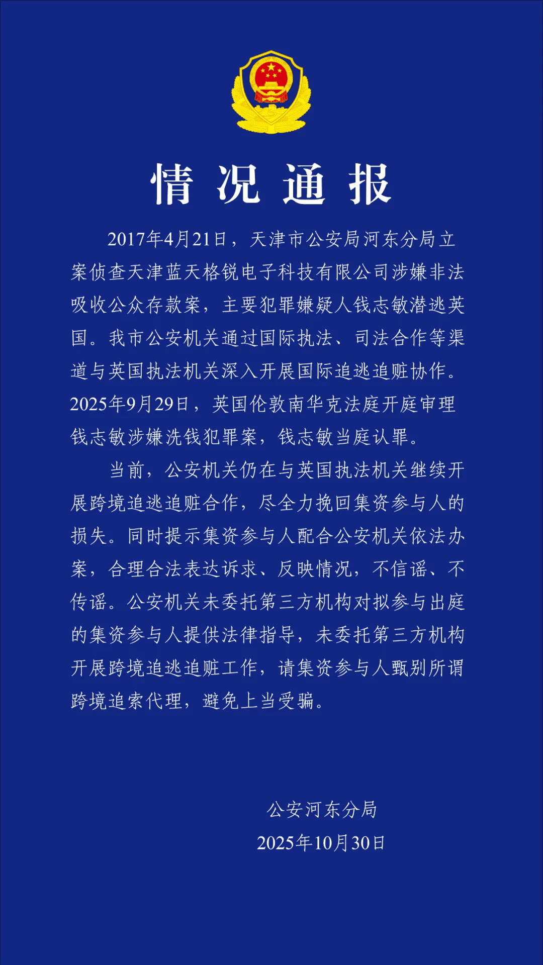 据此前报道,今年10月30日,天津市公安局河东分局发布情况通报:2017年4月21日,天津市公安局河东分局立案侦查天津蓝天格锐公司涉嫌非法吸收公众存款案,主要犯罪嫌疑人钱志敏潜逃英国。天津市公安机关与英国执法机关深入开展国际追逃追赃协作。