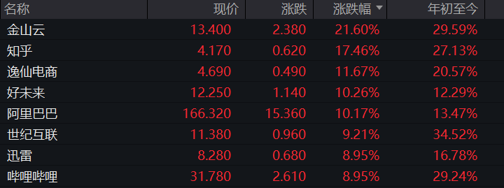 中概股成为当天一大亮点。纳斯达克中国金龙指数涨4.26%,万得中概科技龙头指数涨5.07%。热门中概股方面,金山云涨超21%,好未来涨逾10%,阿里巴巴涨超10%,世纪互联涨逾9%,哔哩哔哩涨近9%,小鹏汽车涨超8%。跌幅方面,霸王茶姬跌逾4%,脑再生跌超3%,拼多多跌逾1%。