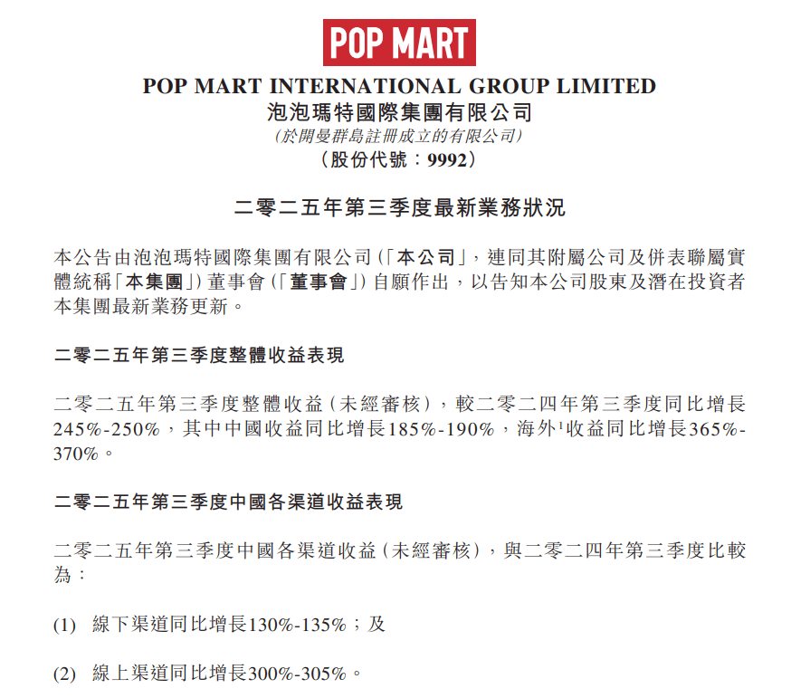 从最新披露的2025年第三季度经营数据看,泡泡玛特2025年三季度业绩延续了上半年的强劲增长态势。公告显示, 2025年第三季度泡泡玛特整体收益同比激增245%至250%。分区域来看, 中国市场收入同比增长185%至190%,其中,线上渠道表现尤为突出,增速达到300%至305%,线下渠道也实现130%至135%的同比增长。 海外市场整体收入同比增长365%至370%,其中,美洲市场 增长1265%至1270%,欧洲及其他地区增长735%至740%,亚太地区增长170%至175%。