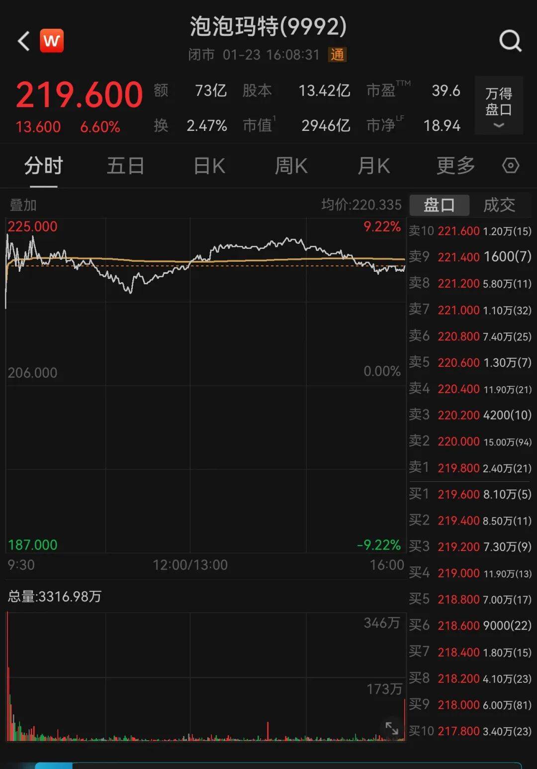 产品爆火也传导至资本市场。1月22日午后,此前股价低迷的泡泡玛特港股快速拉升,涨幅一度超6%,截至1月23日收盘,上涨6.6%,报219.600港元/股,市值攀升至2946亿港元。