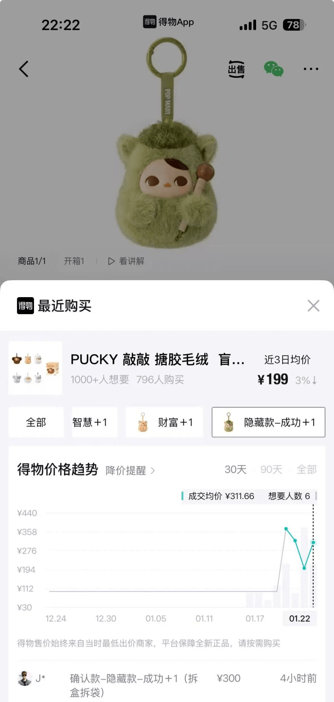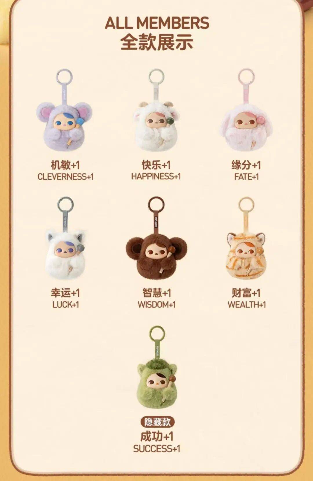 目前,泡泡玛特官网小程序显示已售罄。搜索发现,该系列发售之初, 隐藏款“成功”市场成交价由99元上涨至396元,溢价3倍。常规款中,销量最高的是“智慧”,该产品市场成交价由99元上涨至209元,溢价1倍。