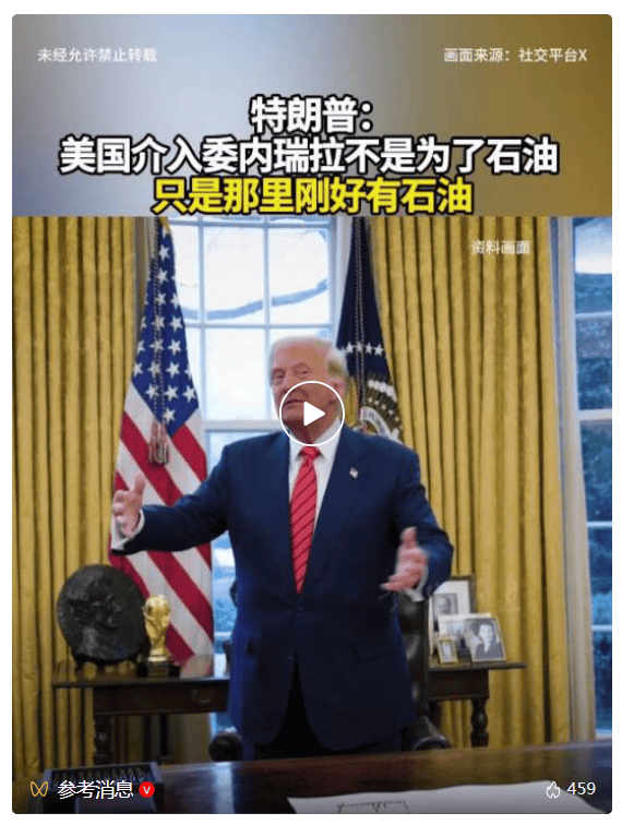 1月13日,@参考消息:据外媒1月12日报道,美国总统特朗普在接受《纽约时报》采访时表示,自己介入委内瑞拉不是为了获取石油资源,“只是那里刚好有石油”。
