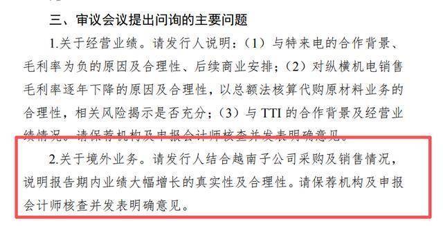在上市委会议现场,上市委要求拓普泰克说明与特来电的合作背景、毛利率为负的原因及合理性、后续商业安排;对纵横机电销售毛利率逐年下降的原因及合理性,以总额法核算代购原材料业务的合理性,相关风险揭示是否充分;与TTI的合作背景及经营业绩情况。