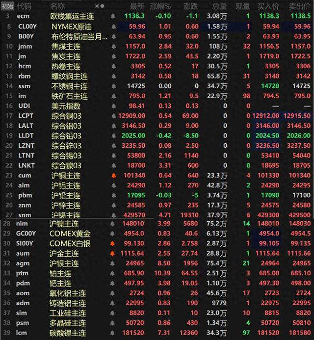 截至日间收盘,内盘基本金属普涨,仅沪铅唯一下跌,跌幅达0.03%。沪锡以4.71%的涨幅领涨,沪镍涨3.99%。沪铝涨1.12%,其余金属涨幅均在1%以内。氧化铝主连涨0.96%,铸造铝主连涨0.83%。