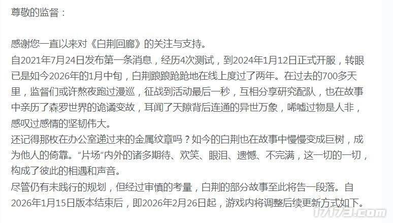 近日由网元圣唐子公司烛龙研发,腾讯运营的《白荆回廊》宣布,因为无法保证今后内容产出的质量,因此游戏将于2026年2月26日停止新角色与版本活动的更新,主线剧情将在后续不定期更新,服务器还会正常开启,玩家可以正常登录。