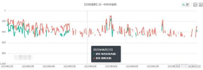2025年上半年,游戏大部分时间在游戏细分的RPG类免费榜里排名400多,下半年游戏大部分时间已经跌出游戏榜了。