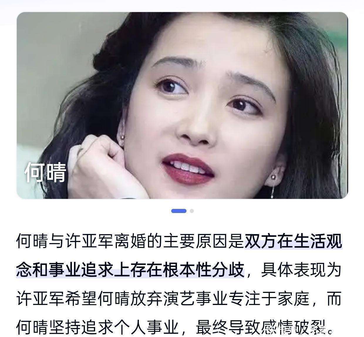 那时,何晴才三十多岁,事业正处于上升期,刚刚拍完几部有影响力的古装剧。她的职业成就并不亚于许亚军,所以她并不想因为家庭的事情就放弃自己的事业。最终,他们选择了分开。