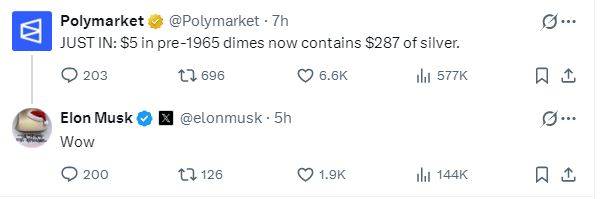 根据社交媒体上的帖子,随着银价飙升至历史新高,美国1965年前铸造的5美元硬币(含银量90%)所包含的白银价值一度达到287美元。马斯克注意到了其中一条帖子,并发出惊叹之声。此前马斯克曾警告银价创纪录飙升将引发工业风险。