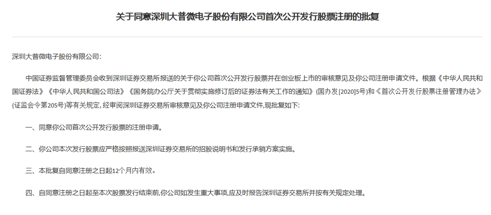 央广网北京1月25日消息(记者 冀文超)近日,中国证券监督管理委员(以下简称“中国证监会”)发布关于同意深圳大普微电子股份有限公司(下称“大普微”)首次公开发行股票注册的批复,标志着创业板首家未盈利企业IPO注册获批。