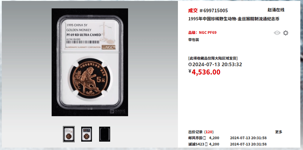 最近,一枚1995年的中国珍稀野生动物金丝猴精制流通纪念币在某拍卖平台上以4536元的高价成交。