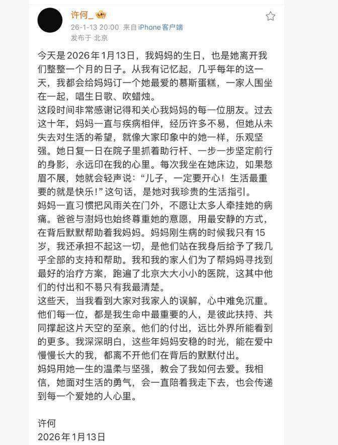 许何的长文中充满了无尽的感怀和对母亲深深的敬爱,回忆起她坚韧的品格以及家庭中的每一份关怀。现在,当他看到外界的一些误解与偏见,心中不免感到沉重。他写道:他们是我生命中最重要的人,曾为我撑起了一片天。妈妈虽然离开了,但她一生的温柔与坚强,依旧深深植根在我的心里。她面对生活的勇气将永远陪伴我,也会传递给所有曾经爱她的人。这些文字中流露出的情感,真挚又动人。