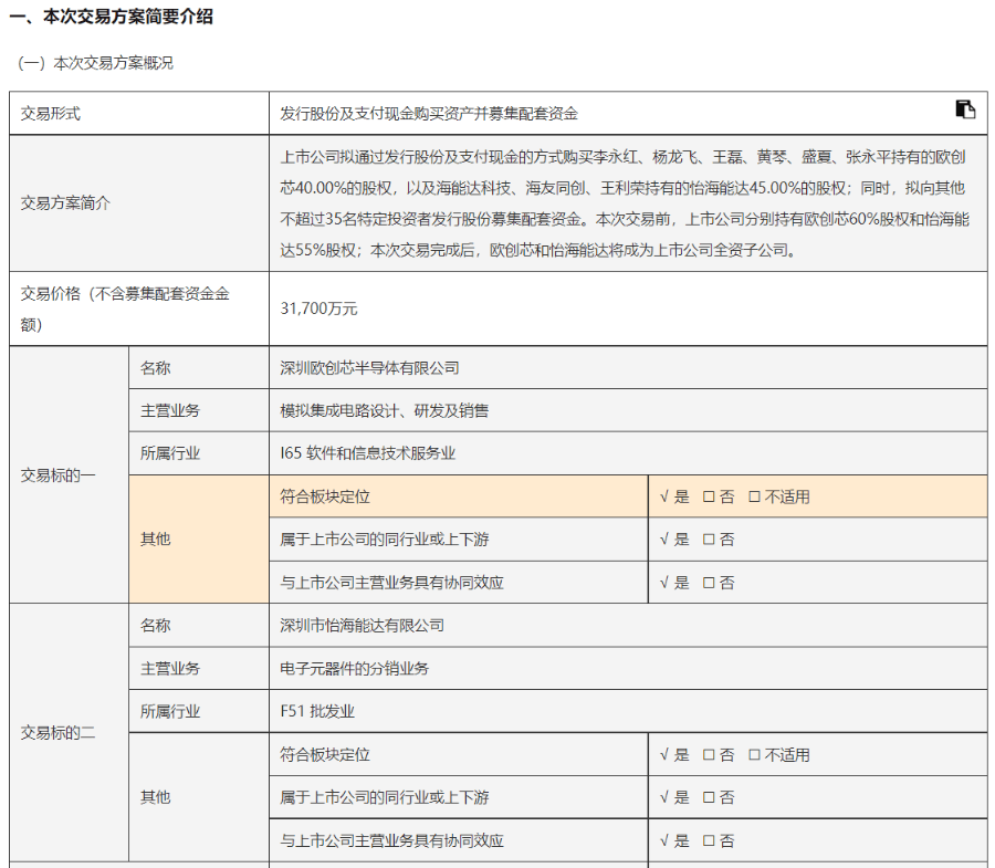 在资本市场的并购浪潮中,雅创电子近期的收购引发广泛关注。 2026年1月1日,雅创电子发布《发行股份及支付现金购买资产并募集配套资金报告书(草案)》公告。根据草案显示,雅创电子拟通过发行股份及支付现金的方式购买李永红、杨龙飞、王磊、黄琴、盛夏、张永平持有的欧创芯40.00%的股权,以及海能达(12.020, 0.00, 0.00%)科技、海友同创、王利荣持有的怡海能达45.00%的股权;同时,拟向其他不超过35名特定投资者发行股份募集配套资金。