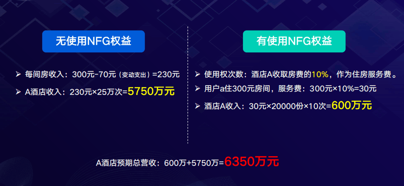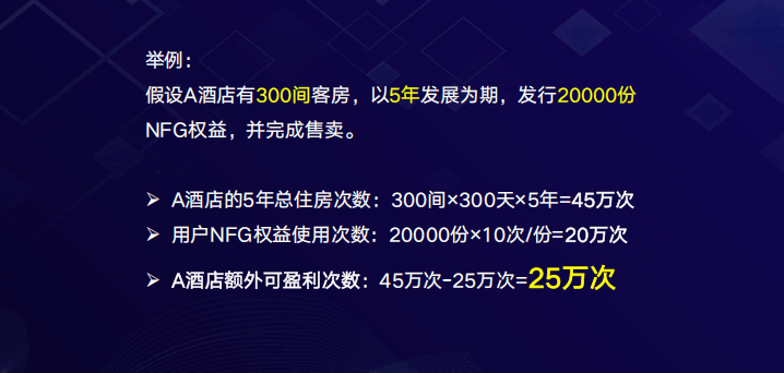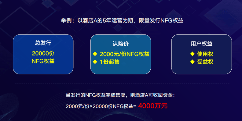 - 酒店以未来5年运营期为基准,将部分客房使用权与经营收益权打包为NFG权益,限量发行。