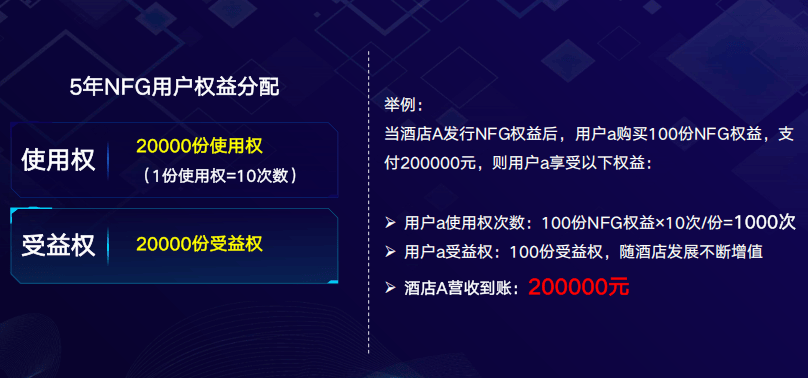 假设某酒店发行2万份NFG权益,每份售价2000元,对应10次住宿权+1份受益权。用户购买100份,支付20万元,获得: