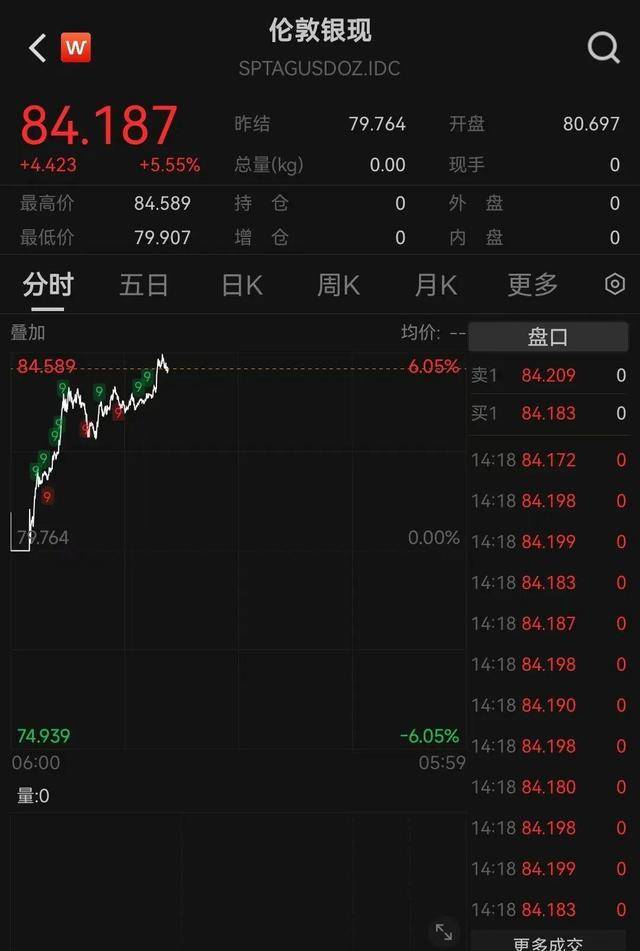 此外,伦敦现货白银站上84美元/盎司,涨幅超5.5%,突破两周前高点,创下历史新高。