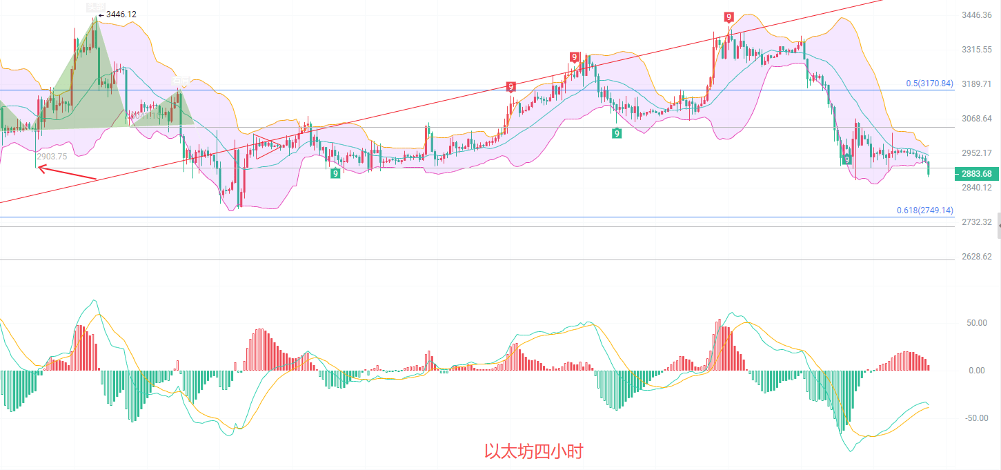 四小时K线表现的更加明显,EMA趋势指标向下交替扩散成型,现在快慢线拉开身位以后行情就会出现急跌或者急涨的趋势,MACD底部背离放量减少,DIF和DEA若在0轴线下方形成死叉趋势,那么市场情绪就会被点燃,关注前低2770,布林带下轨实收2913,短线趋势进入极端超卖,所以短期有回调的需求,没有南下的币友可以等回调以后南下