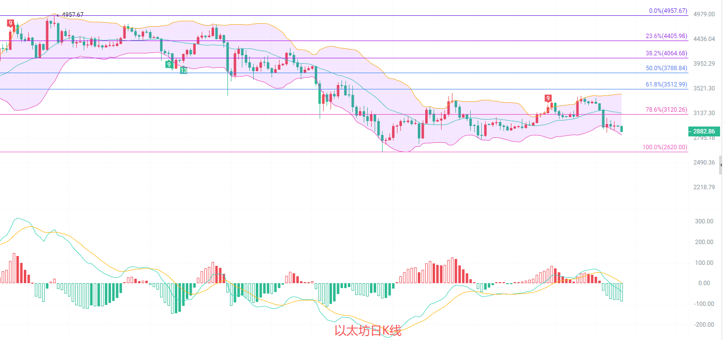 日K线发稿前最高2960,最低2874,EMA趋势指标向下扩散跌破了黄可分割线0.786一线,EMA15趋势快线已经来到了3060,按照这种趋势上判断,短线压力位在3000关口附近,MACD缩量走空,DIF和DEA跌入0轴线进入南下趋势,布林带下轨来到了2830,若行情继续走南,那么布林带向下就会形成新的空势,