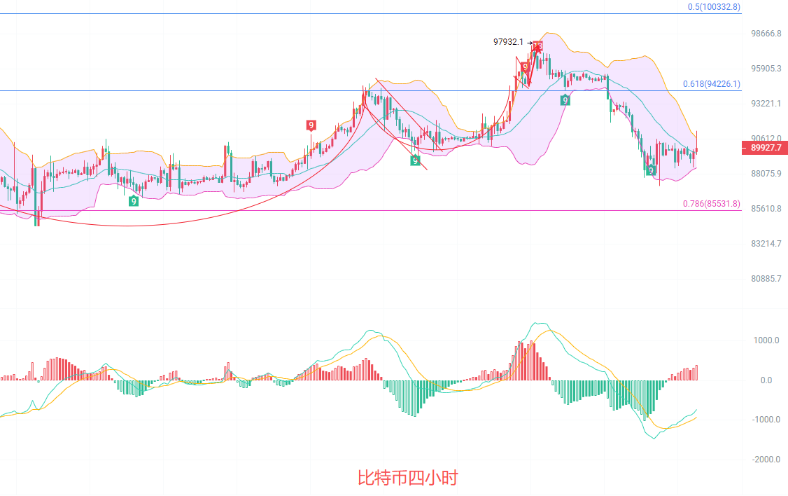 下方87500到88500不破北上,止损400点,目标看89500到90000,破位看91000