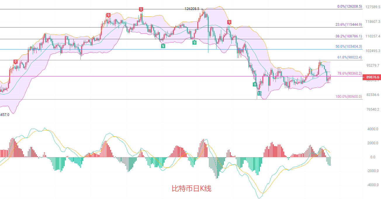 日K线发稿前最高91200,最低88530,EMA趋势指标收缩继续走南下,EMA15和30形成的压力位有效可以看下,MACD连续缩量增筹,DIF和DEA在0轴线上方向下冲击,若行情继续走南,就会进入0轴线下方,布林带上轨关注92300,若中轨失守南下止损离场,反之持有,目标关注下轨87500