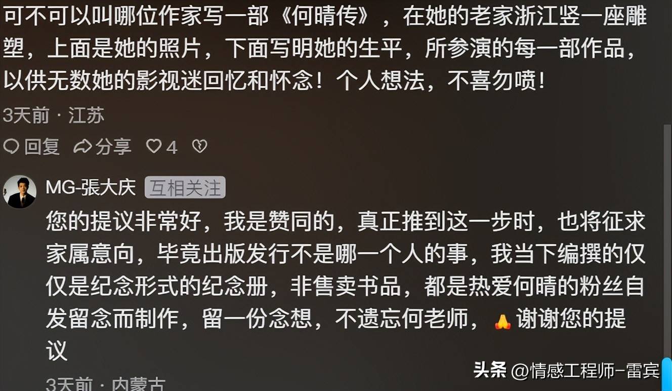 目前,张大庆所编撰的仅仅是一本纪念性质的册子,并非市面上销售的书籍,而是希望通过这本纪念册,让何晴的粉丝留下一份珍贵的回忆。这些行动并非为了营利,而是发自内心的纪念。甚至在设计封面时,张大庆也反复修改了好几个版本,最终才确定了这款白色封面。可见,他对这份纪念投入了极大的心血。
