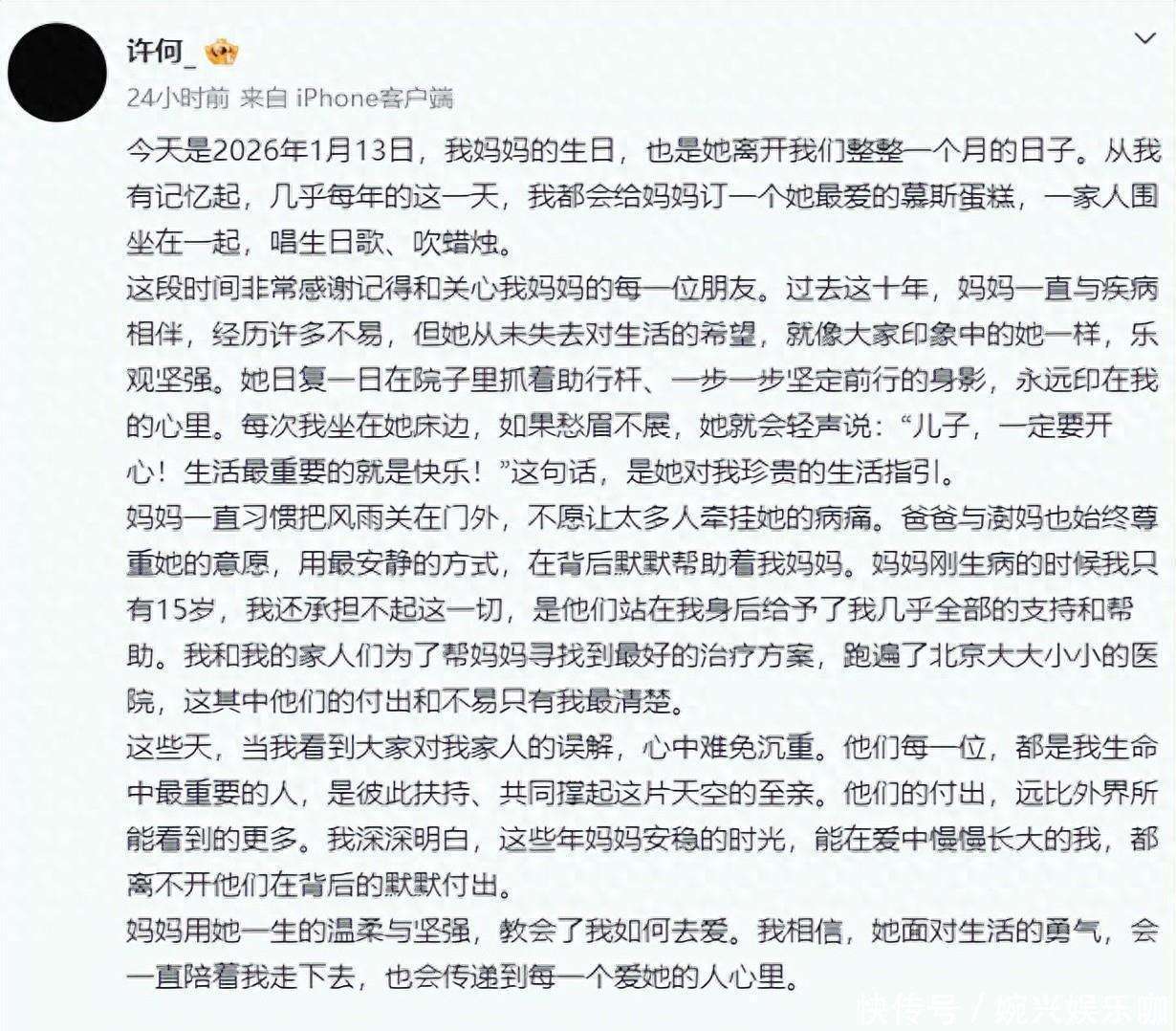 1月13日,知名演员何晴离世已整整一个月,而这一天恰好也是她62岁的冥诞。那晚大约八点钟,何晴与许亚军的儿子许何发文悼念母亲。文章的字里行间充满了悲痛与哀思,感情真挚,难掩泪水。然而,细腻的文字却也在某些细节上引发了一部分网友的激烈讨论。