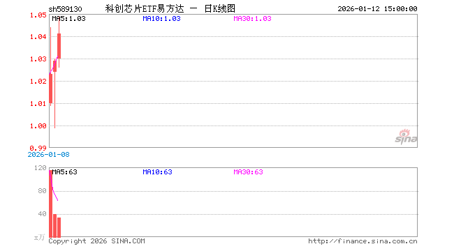 科创芯片ETF易方达(589130)业绩比较基准为上证科创板芯片指数收益率,管理人为易方达基金管理有限公司,基金经理为李栩,成立(2025-12-29)以来回报为4.12%。