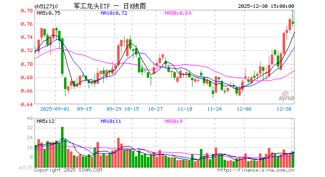 12月30日,军工龙头ETF(512710)跌0.91%,成交额9.79亿元。当日份额减少1700.00万份,最新份额为131.43亿份,近20个交易日份额减少74.18亿份。最新资产净值计算值为99.81亿元。