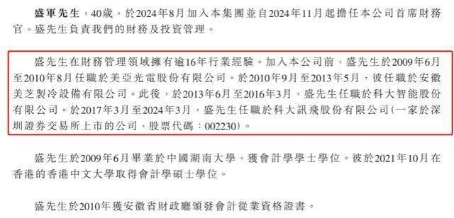 盛军,40岁,于2024年8月加入集团并自2024年11月起担任公司首席财务官,负责公司的财务及投资管理。