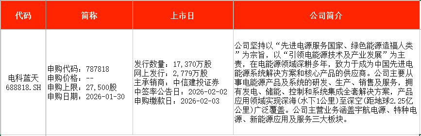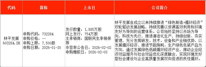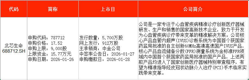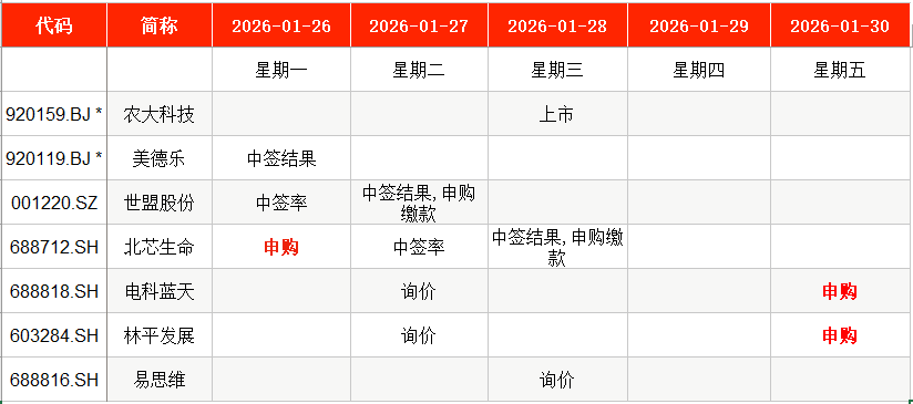 从时间表看,北芯生命(688712)将在本周一(1月26日)申购,电科蓝天(688818)、林平发展(603284)将在本周五(1月30日)申购。